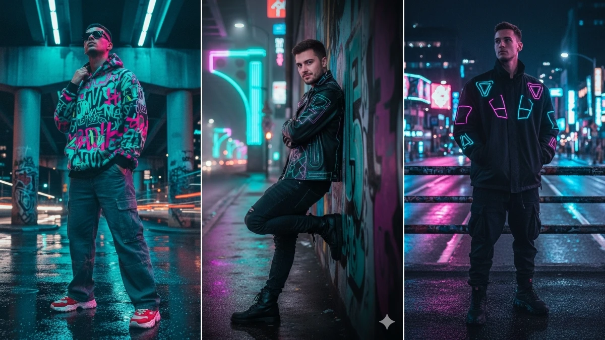 Neon-lit urban portrait with wet pavement reflections and bokeh